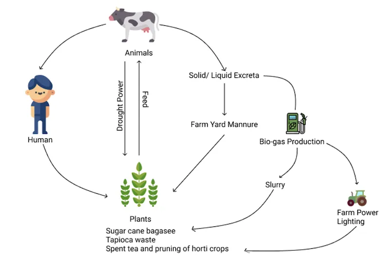 - Cow produces 8 tonnes of farm yard manure per year and farm biomass and farm products which includes fodder, feed, edible weed, tree fodder, bund grass are better utilized — and converted to Edible products like — Milk, Meat and Egg.