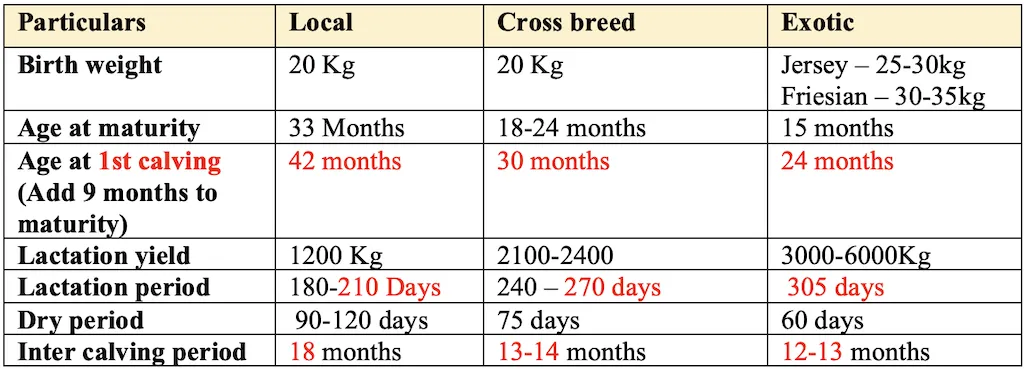 | Age at first calving | Crossbred cattle: 24–30 months; Indigenous: 36–48 months |