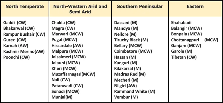 | Shahabadi | Bihar | Dual-purpose; coarse hairy wool (~52 µm) | MCW |