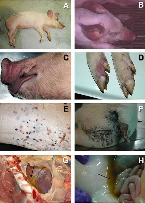 - High body temperature, lethargy, yellowish diarrhoea, vomiting, and purple skin discolouration of the ears, lower abdomen, and legs.