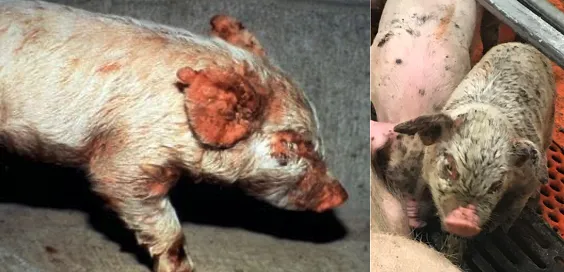 | Exudative Dermatitis | Bacterial | S. hyicus | Greasy skin, 5-35 days age |