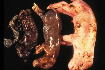 - Small mummified piglets in the afterbirth present. The presence of mummified foetuses of varying sizes is a classic indicator of PPV infection, as the virus kills foetuses at different stages of development. Vaccination of gilts before their first breeding is the most effective preventive measure.