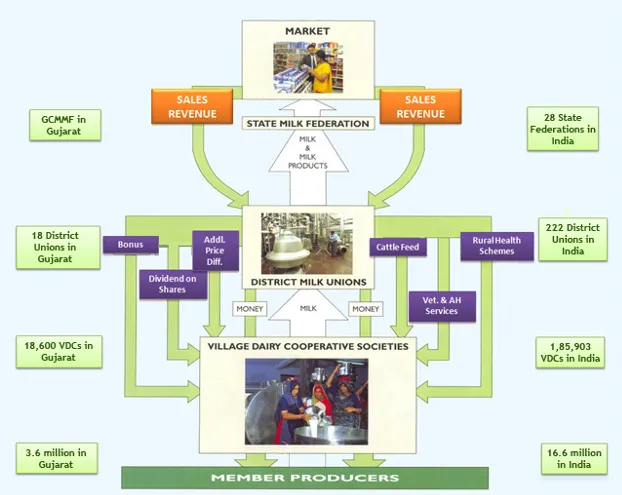 | Anand Model | Three-tier cooperative: Tier 1 = VDCS (village), Tier 2 = DMU (district), Tier 3 = State Milk Federation |